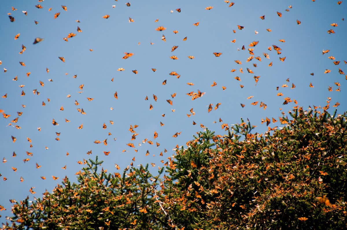 At first glance, it looks as though the trees are covered with rusty autumn leaves. But you soon realise that you are looking at millions of butterflies, covering the oyamel fir trees in a delicate, quivering blanket of black and orange. Though each butterfly weighs less than half an ounce, they mass together in a colony, clinging to the trees in huge clusters to survive the cool winter temperatures. When the sun warms their parchment-thin wings, the monarchs take to the sky in a fluttering cloud of orange – so many that the air hums with their movement.