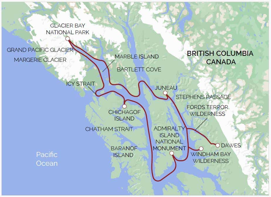 One of the straightest stretches of the Inside Passage, Stephens Passage is located between Admiralty Island to the west and the mainland and Douglas Island to the east. The passage is generally considered to offer some of the best whale-watching waters in Alaska: a misty spout is a sure sign they’re in the neighborhood. It also holds plentiful populations of Steller sea lions, as well as flocks of gulls and guillemots that clatter aloft as the ship passes. The passage was named by George Vancouver in 1794 after being charted by Joseph Whidbey.