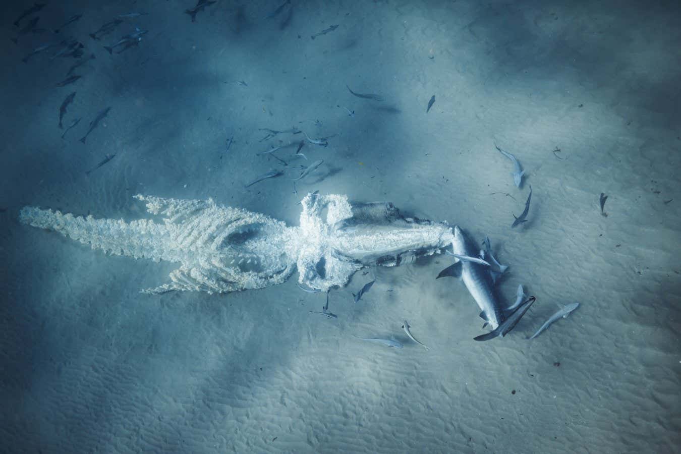 Whale remains being eaten by a tiger shark and other scavengers on the seabed Laura Gourgas